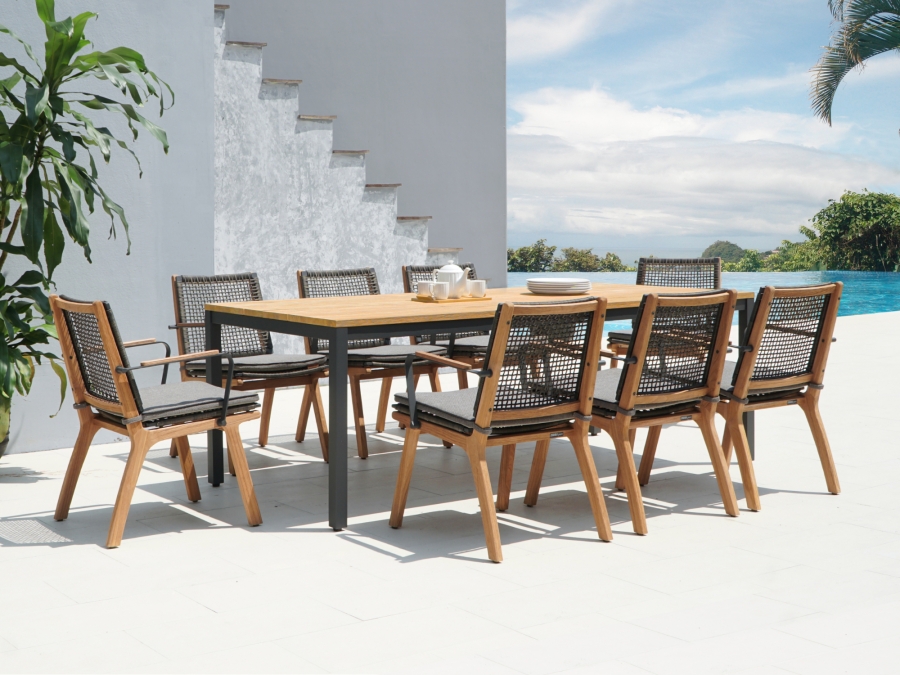 Das Gestell des Zebra Alex Gartentisches ist aus pulverbeschichtetem Aluminium gefertigt, welches in einer stilvollen graphitgrauen Farbe daherkommt. Besonders erwähnenswert ist die Tischplatte aus aufgearbeitetem Teakholz, bekannt für seine Beständigkeit und Haltbarkeit.